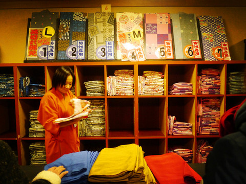 挑选浴衣和腰带,虽然说浴衣大概有十几种花色可选,但是并没有特别好看的配色,到更衣室换好浴衣(墙上细心的还贴有如何正确穿戴浴衣的示意图),就可以选择泡汤或者上街去玩。
