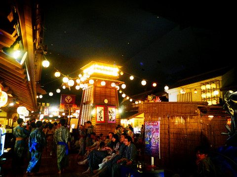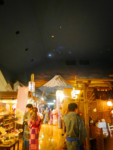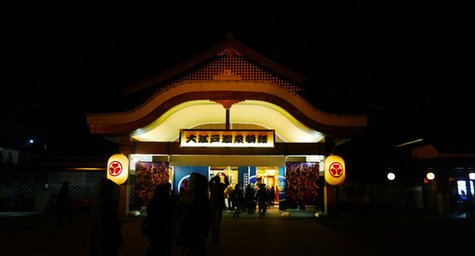 大江户温泉物语在东京,搭乘临海高速铁道的时候能看到摩天轮,经过彩虹桥。温泉的主打是再现了江户风貌的古老街坊以及地下1400米深的天然温泉水,特别适合仅在东京旅游的客人体验日本泡汤的文化。