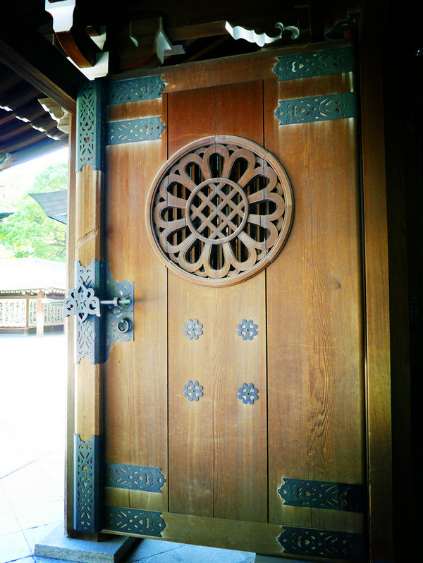 再走一段路会到神门,两扇门上各有一象征皇室的16瓣金色菊花纹章,过了神门回头看,可以看到屋檐被设计成日本军刀的样子,非常有军国主义元素。