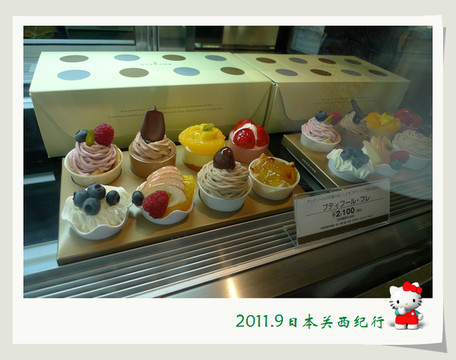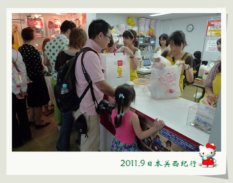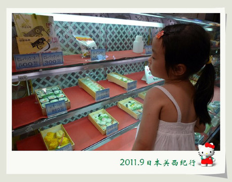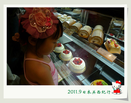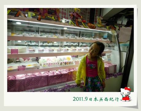 两家人先上到京都站二楼的京都旅游信息中心,咨询了一些旅游信息,并买了4张京都巴士一日券,然后就来到了楼下的JR绿色窗口,购买了第二天乘坐嵯峨野小火车的车票,再接着就去到了伊势丹百货店地下的食品商场,为小花挑选了一个6寸的草莓奶油蛋糕,蛋糕柜台的服务员因为知道是小朋友的生日,特意给配了巧克力的“生日快乐”牌和细细的生日蜡烛。