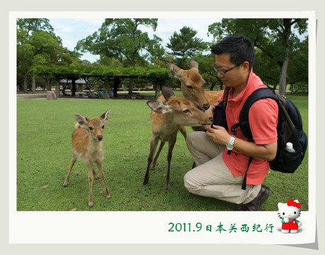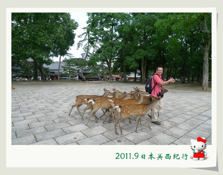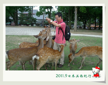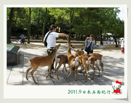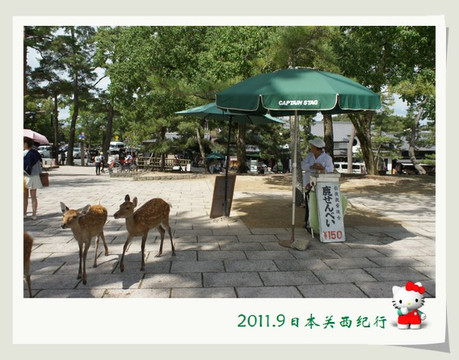 公园的广场边有卖鹿煎饼,游人可以买了这煎饼之后喂给鹿吃。这些平时看上去温和的、散漫的、胆小的鹿只要一看到有游人去饼摊的大妈那里买了鹿煎饼,立马就围了上来。那种你争我夺的场景还真把人可以吓一大跳。