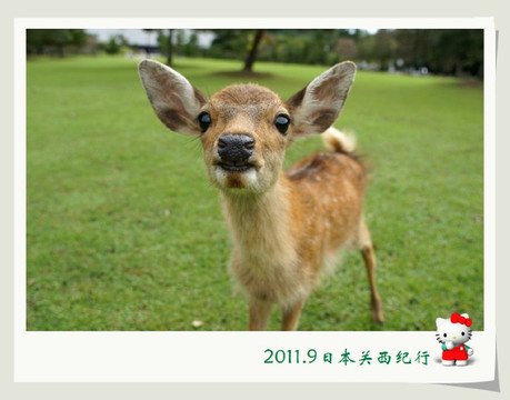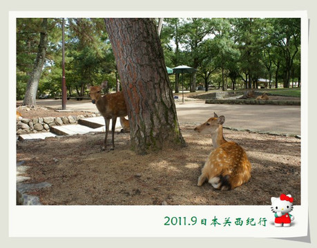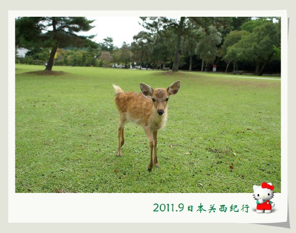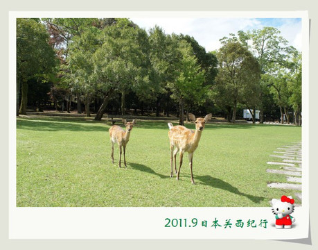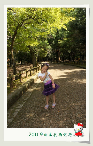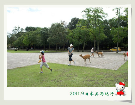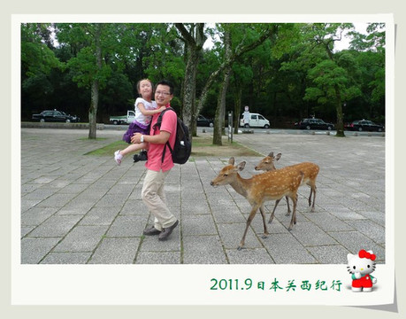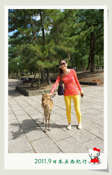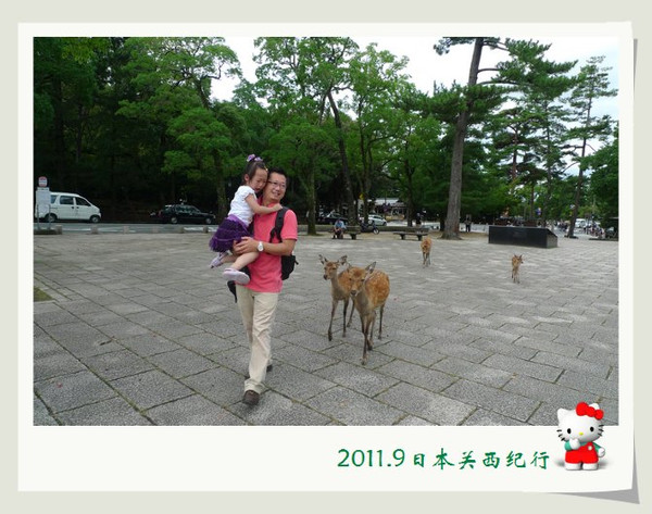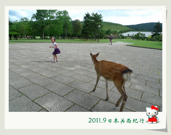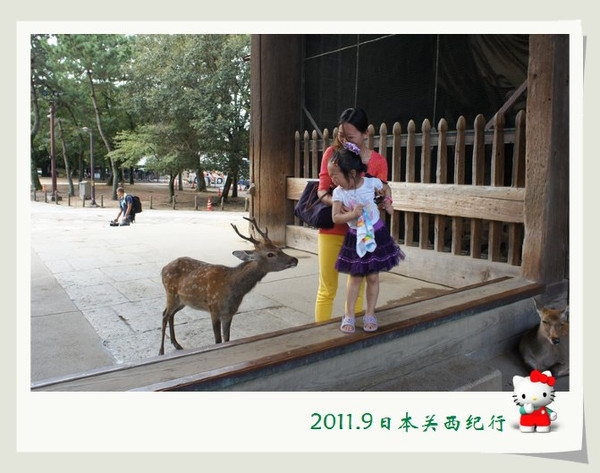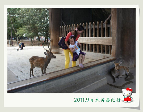 和小鹿玩了一会儿,我们就离开公园步行前往东大寺了。一路上还会碰到很多小鹿。花妈趁机和小鹿合影,小花心有余悸,远远地躲开了。