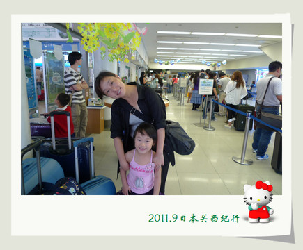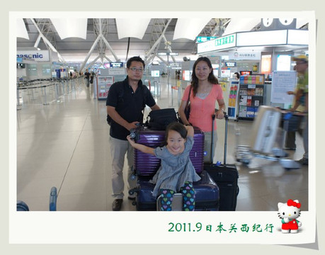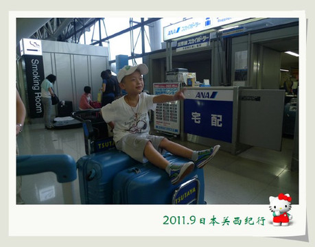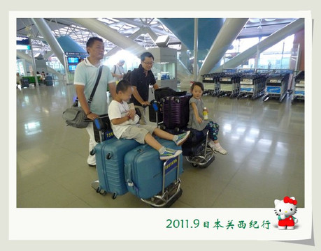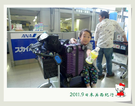 差不多一个小时的时间就抵达了关西机场。找辆行李车装上箱子装上孩子,轻轻松松地就前往了A区的办票柜台。两个孩子坐在行李车上非常怡然自得,还时不时地要催一下花爸:“快点快点,要超过乐乐!”