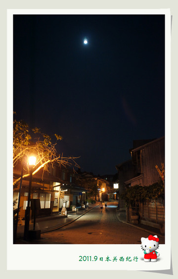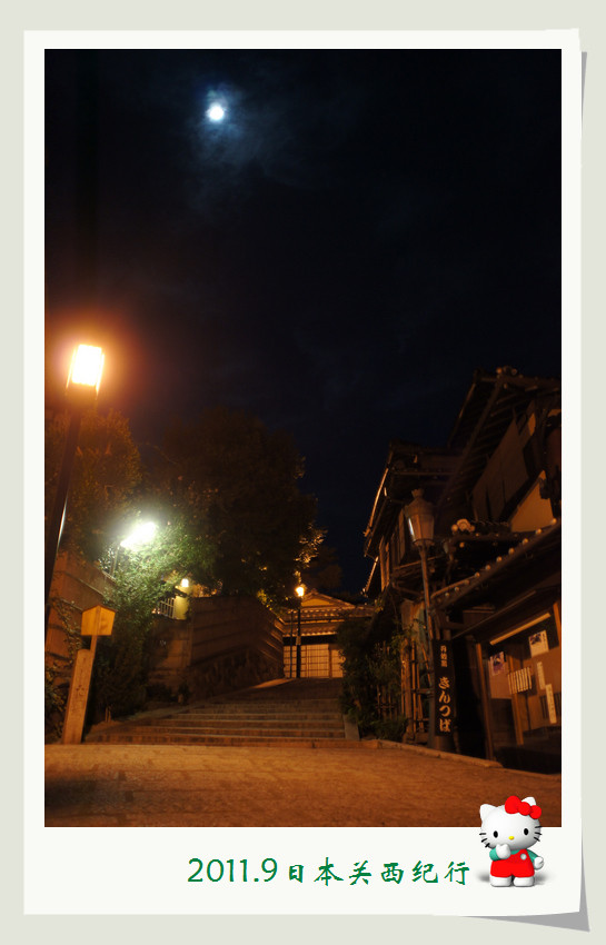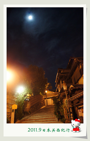 白天熙熙攘攘的二年坂,此时安静得如同入睡了一般,孩子们顺着石板路走在回家的路上,开心的欢笑声如同银铃般洒落在这月光照耀的夜色之中,有如天使一般。