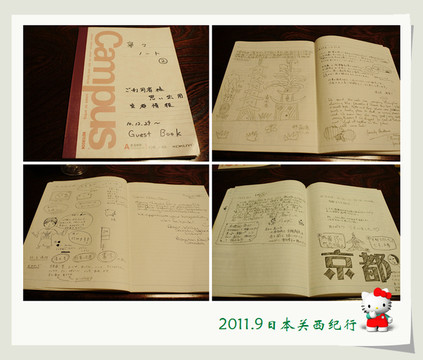 在起居室里有几本笔记本,这是曾经在这里住宿过的人的留言,有来自日本国内的,也有来自海外的,日文的英文的字里行间中留下了大家对二年坂宁宁这个在京都的住宿的美好记忆。花爸一边读这些留言,一边给大家翻译,似乎别人的感受也渐渐地传递到了我们的身上。