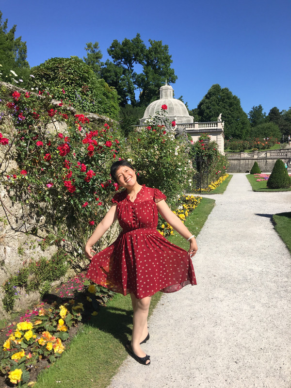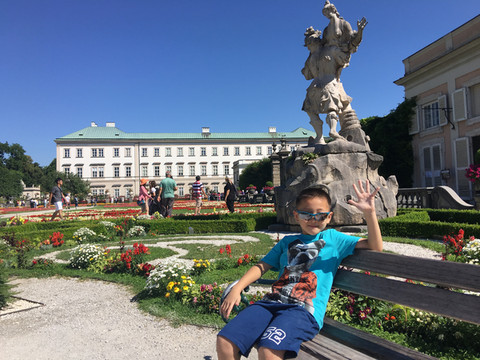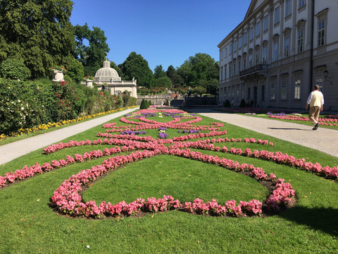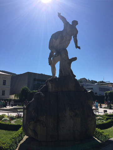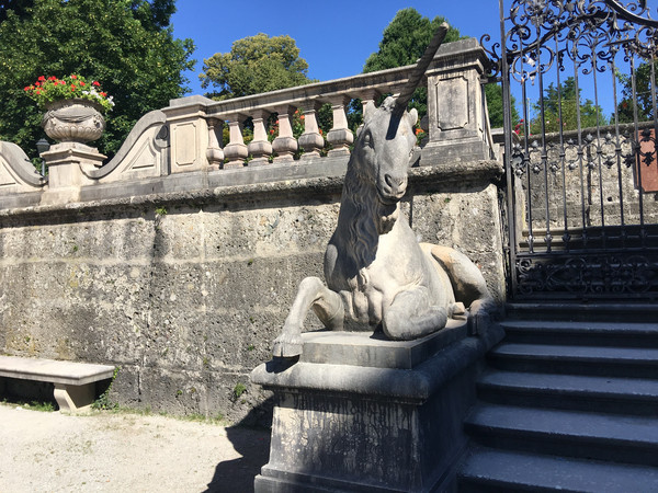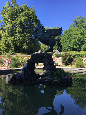 我们按照昨天探访好的路线停下车,第一站是米拉贝尔花园(Mirabell Gardens),花园的故事基本以八卦为主,其实不管主教也好,百姓也好,有个自己喜欢的人,愿意为她/他造这么个花园,都是一件幸运的事情!米拉贝尔宫与花园异位同体,一而二二而一,花园是宫殿的补充,宫殿是花园的灵魂。大殿门口的飞马喷泉雄健昂扬,马匹前蹄扬起,振翅欲飞,马鬃马尾的细节都做得极为精细,展示着一种腾飞的意愿;而花园里的喷泉则简单得多,大水池中间一股清流直上重霄,有着水的温婉,也有着水的力量。透过水柱可以看到远处白云底下的雄伟的萨尔茨堡要塞,确是刚柔并济之感。著名的电影《音乐之声》就有许多镜头是在这个宫殿与花园里拍摄的,有兴趣的朋友可以找来看看。