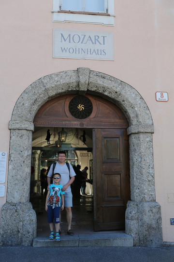 从米拉贝尔花园往南没多远,就到了莫扎特故居——现在叫“莫扎特博物馆”,粮食大街8号,一栋4层的黄色小楼,奥地利乃至人类历史上最伟大的作曲家之一、音乐神童莫扎特就出生在这里。莫扎特生于1756年,卒于1791年。他四岁学琴,六岁作曲,现在钢琴考级曲目中还有他七岁作的《奏鸣曲》,这位音乐神童却极端厌恶萨尔茨堡,这里虽然给了他作为神童的辉煌,但更多的是对以主教为代表的权贵的憎恨。莫扎特向往自由,向往充满活力与新意的生活,创作了大量的堪称不朽的器乐作品与歌剧作品。虽然他只活了短短的35年,但他的音乐将流传百世!