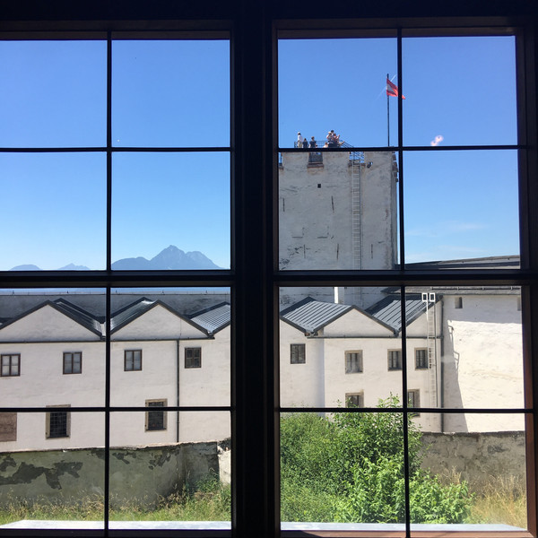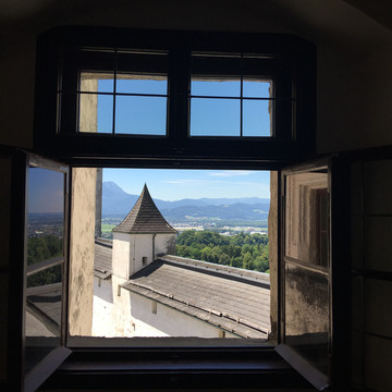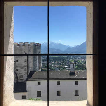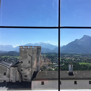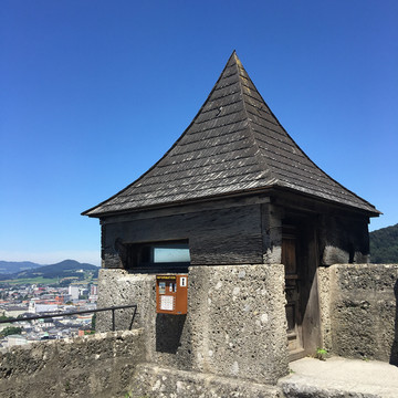 依然搭乘高速缆车直接上到山上,从缆车站出门右转再左转一下,就到了塔楼的下面,凭门票领取讲解器(德语、英语)之后,直接向前走,左转,进入幽暗的通道,虽是中午光线最好的时候,也只有瞭望孔能进来一些光线,整个走廊相当的昏暗。转了两个弯就开始爬楼梯,楼梯外面是方的,中间一根柱子,盘旋而上,让人爬得很是无语,也不知道几楼了,总归使劲往上爬就是了。塔楼的顶端是一个十来米见方的平台,中间再起一个小高台,以方便哨兵观察瞭望之用。现在这里插着奥地利的国旗,骄阳之下,放眼望去,远处的雪山,近处的萨尔茨堡城,脚下的大教堂,邻近的修道院,一览无遗,真是心旷神怡!