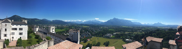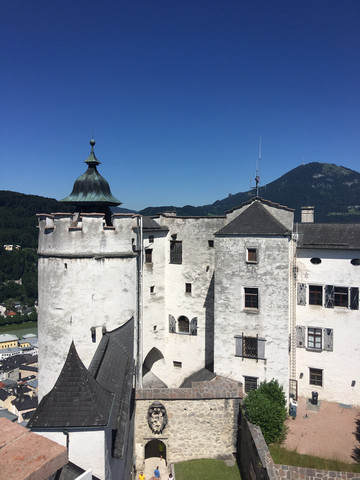 然后就是今天的重头戏啦,豪恩萨尔茨堡要塞(Hohensalzburg Festung)。要塞位于萨尔茨堡高地的小山顶上,傲然屹立,俯视全城。从政教争权的时代起,大主教营建萨尔茨堡这个军事要塞作为自己安全的保障,至今900多年了,经历大小争战无数,这个要塞还从来没有被攻克过,牛不牛?
