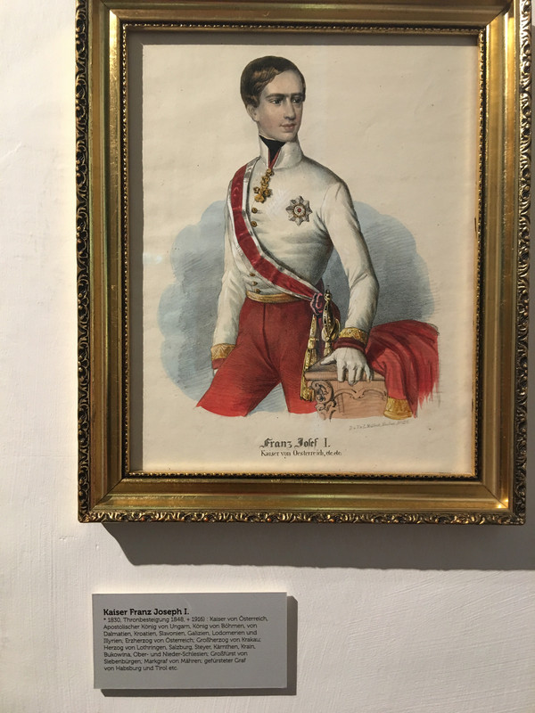 然后还有萨尔茨堡地区生活、军事等各方面的文物陈列,还有奥地利历代国王的画像,包括茜茜公主的丈夫,奥匈帝王的缔造者——弗兰兹·约瑟夫一世,他是哈布斯堡家族的嫡系传人,是一位非常了不起的君王。可惜,命运就是这么拧巴!约瑟夫一世鼎盛时期统治着中部与南部欧洲的大部分土地,他外貌英俊年轻有为,能说八种语言,娶了颜值顶级的表妹茜茜公主,如此完美的人生到谢幕时又如何呢?他爱了一生的妻子早就出走他乡,后来在日内瓦被刺身亡;他的亲弟弟让墨西哥人给打死了;唯一的儿子30岁时吞枪自尽;指定的王位继承人斐南迪亲王则在萨拉热窝事件中遇刺身亡并引发第一次世界大战。。。可见,甭管是什么人,笑到最后的才是赢家!美好的只是电影,不是真实。