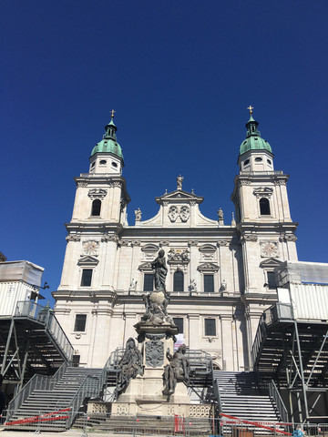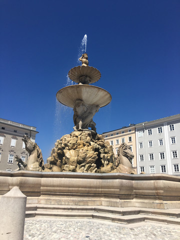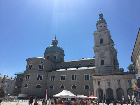 离开莫扎特故居,我们在明艳的阳光下,前往古城区,探访那座神秘、古老的萨尔茨堡要塞。进入古城区,在大教堂广场边上,我们先找了家甜品店买了蛋糕、饮料,补充一下能量,到那个著名的大喷泉边拍拍照片,然后进入。