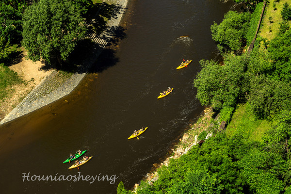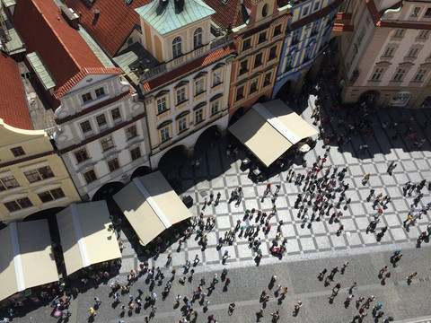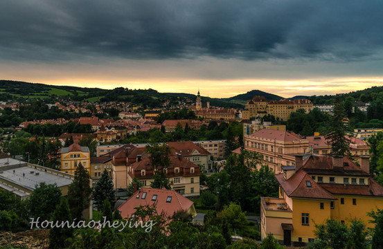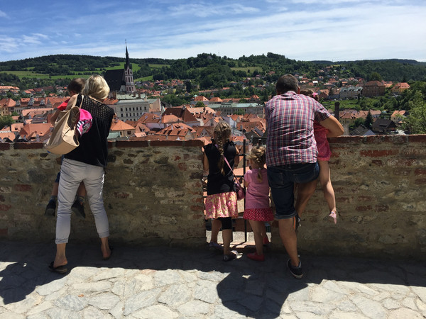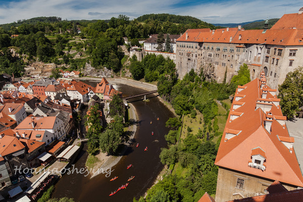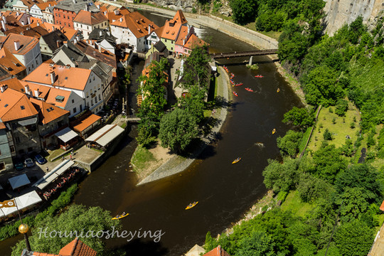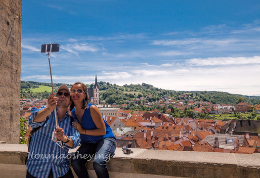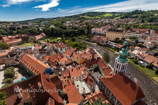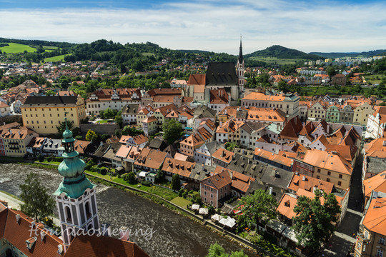 两拖四家庭鸟瞰克鲁姆洛夫小镇街景 iphon6拍摄