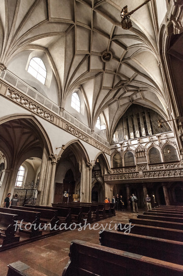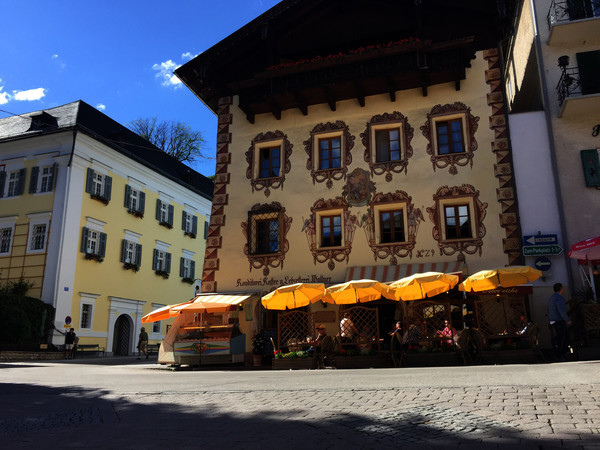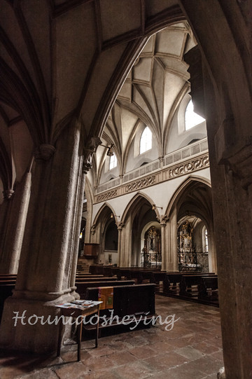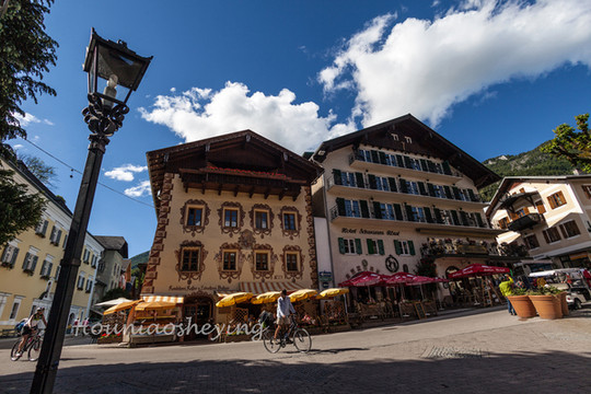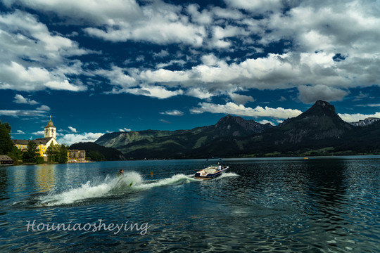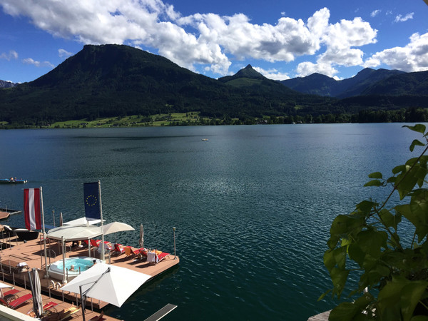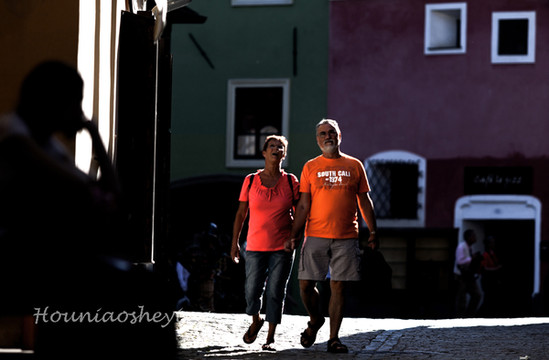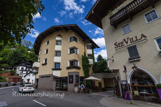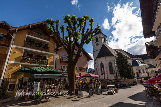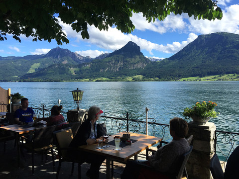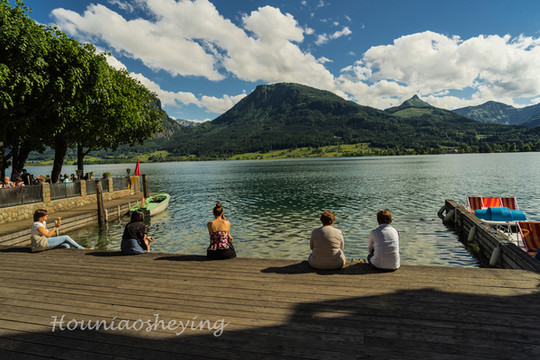 午餐就在酒店附近的餐厅。拍到自己心仪的作品,大家心情特好,午餐也在欢快的气氛中进行。下午3点早已在网上联系好的两辆奔驰面包车准时到达来接我们。由哈尔施塔特去捷克的克鲁姆洛夫小镇,有3个多小时的车程。包车时告诉多付点钱就可以在途经的圣沃夫冈小镇停留2小时,这正是我们所希望的。于是,45分钟后到达圣沃夫冈。圣沃夫冈是奥地利休闲度假胜地,主要是欧洲人在这里度假。圣沃夫冈小镇位于山峦叠嶂之中,小镇临圣沃夫冈湖,湖长10公里,宽1公里,面积虽不大,但地质经冰河时期的切割,水深可达114米,周围被茂密的林带、绿地和陡峭的高山群环抱,湖水随着季节变幻而时蓝时绿,圣沃夫冈湖区是最美丽一段。环绕圣沃夫冈湖的圣沃夫冈小镇,建筑与奥地利的其它旅游小镇相比显得更加豪华和装饰性强。因为是淡季小镇的游客还不算多,我们悠闲地在小镇渡着方步,与小镇的居民同享蓝天白云也是一种时尚。