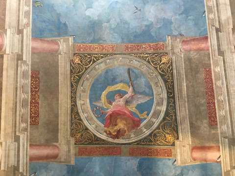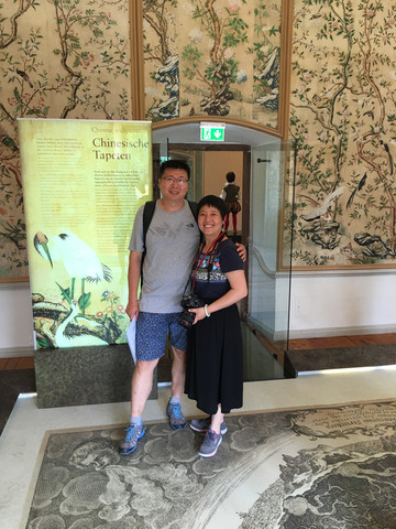正殿介绍了亮泉宫的建造、相关大主教的生平还有一些古生物标本和雕塑,有个人面卧狮雕塑给我留下很深的印象,这个伏在地上的狮子有着一张男人的面孔,硕大的头颅、呆滞的眼神、披散如鬃毛的长发,透着不尽的悲伤。正殿的看点除了这些之外,还有马斯卡尼创作的壁画,一间中画画风壁纸的中国厅,说真话中国古代还真没有贴壁纸的习惯,而且壁纸的风格是工笔花鸟的,画法比传统的中国画法似乎也不完全一样,大体是中国风罢了。