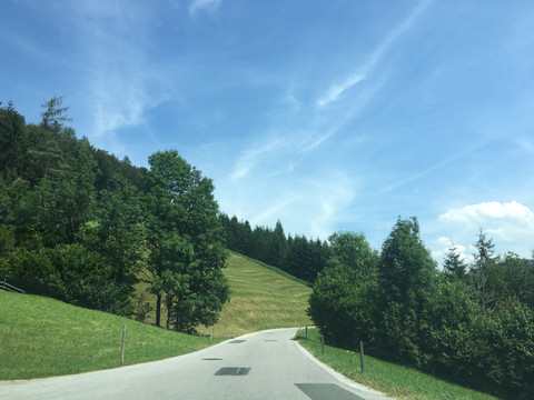 下午三点钟我们出发前往下一个目的地:。导航上给出两条路线,一条回到萨尔茨堡城区,我就选择了不回城的另外一条,又是一个意外之喜——这是一条翻山过去的路,小路在山里盘旋,曲曲弯弯的,两边多是茵茵碧草,有的地方则是茂密的树林,时不时的还有一条小溪山涧,偶尔能看到一两户人家。。。呵呵,十来公里长的山路,真是好美啊!