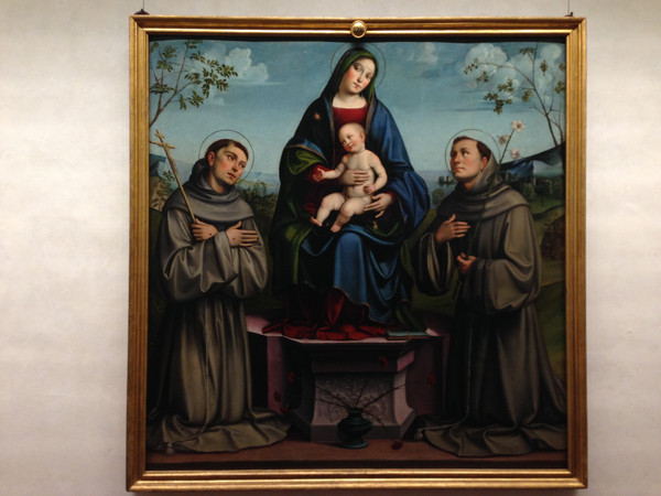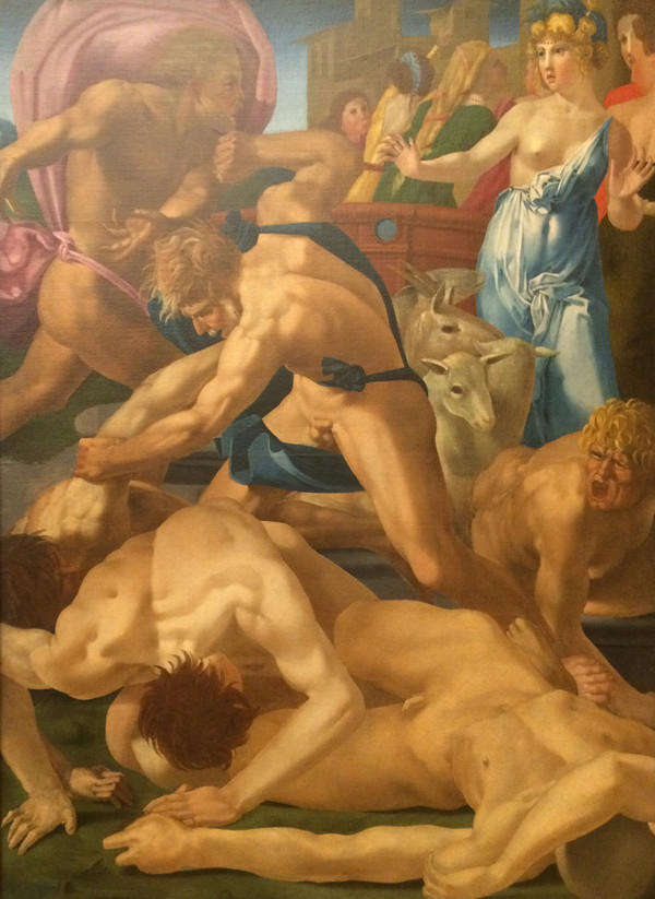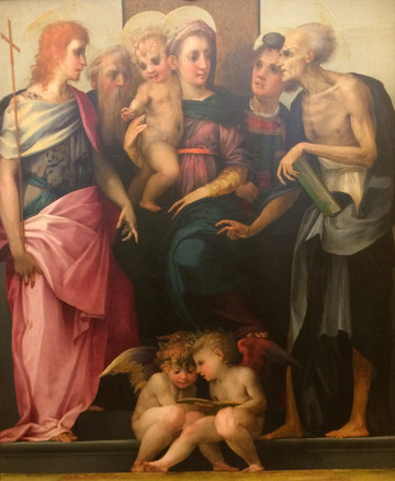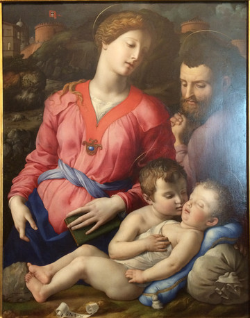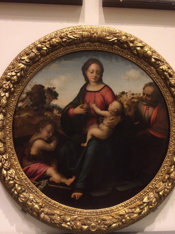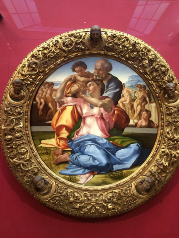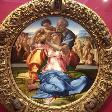 《圣家族》是米开朗基罗在这里唯一的一幅画作,描绘圣母、圣约瑟和圣婴基督,画面洋溢着圣家庭的温馨,画中人物也像他的雕塑作品一样,肌肉强壮健康有力。