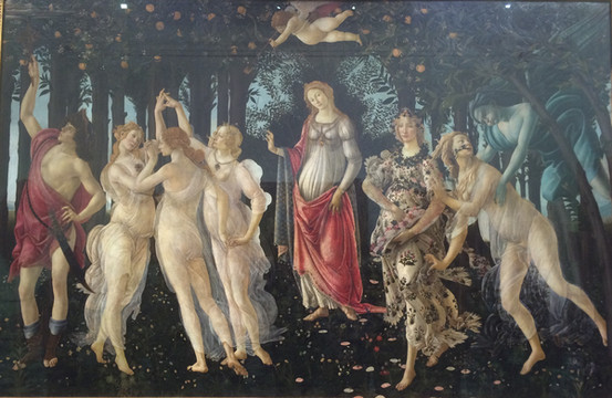 《春》波提切利代表作,文艺复兴时期第一幅以异教神话为题材的作品就是这幅作品。画中为古希腊和古罗马的女神。