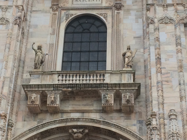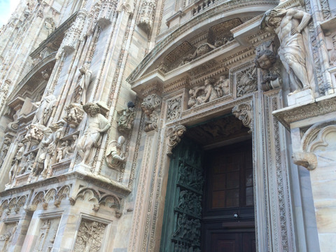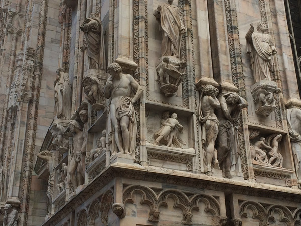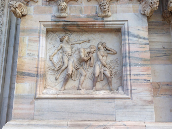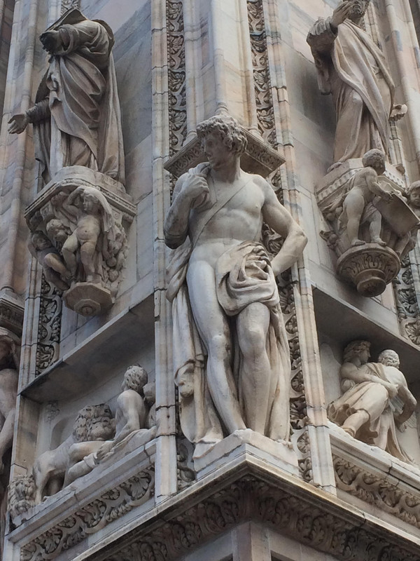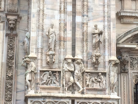 教堂外墙面上的雕塑,旁边的建筑是,后面小圆顶建筑是洗礼堂