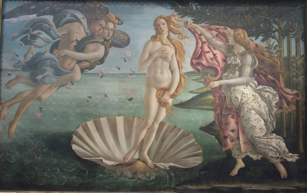 《维纳斯的诞生》是波提切利的名作,描述维纳斯从爱琴海中诞生,在波涛汹涌的海面上,维纳斯以金色长发作衣,从一个张开的贝壳中冉冉升起,风神把她吹送到幽静的岸边,而春神芙罗娜用繁星织成的锦衣在岸边迎接她,身后是无垠的碧海蓝天,维纳斯娇弱无力忧郁惆怅地立在象征她诞生之源的贝壳上。
