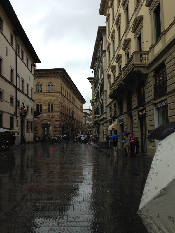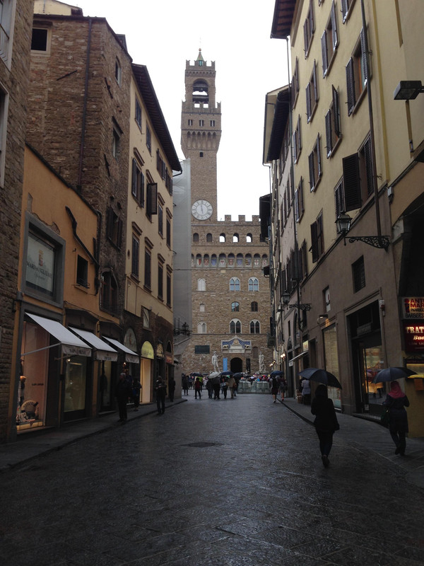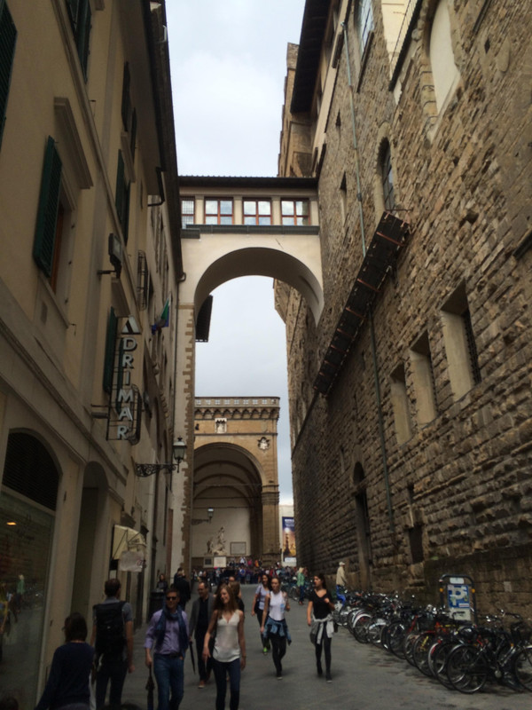 出乌菲兹美术馆往广场而去,已开始下起了小雨,两旁的楼上就是美术馆的展厅。