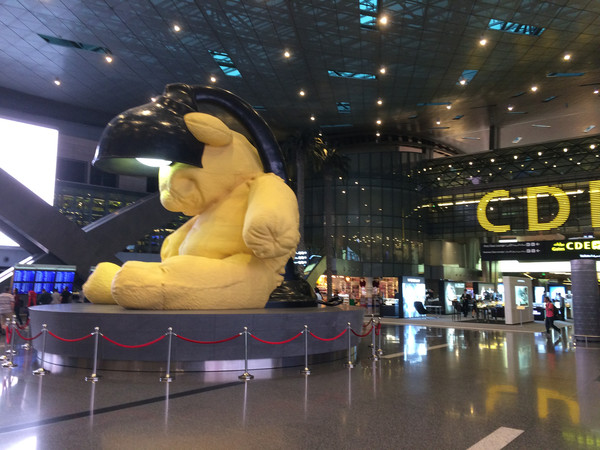 中途转机都是大家担心的事情,之前查看了一些攻略均不得要领,实际往返之后感觉还是比较方便。多哈机场航站楼比较大,分为A、B、C、D四个候机区域,标志非常清楚。下飞机后乘摆渡车到航站楼,乘客大部分都是转机,转机和到达分路的地方有标注也有服务人员,不能确定时可出示装机票的纸袋(黄色表示转机),服务人员就会给你指示路径。转机旅客不再出关或入关,但是要经过一次安检。安检大厅就有航班显示屏,在此可以找到下一个航班的候机地点。航站楼大厅中央是非常热闹的免税商店区,到C、D候机区域还要经过很长的通道,大约走十多分钟,沿途也是休息区和免税店。从下飞机到候机点正常情况大约需要三十多分钟的时间。