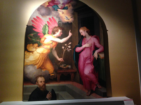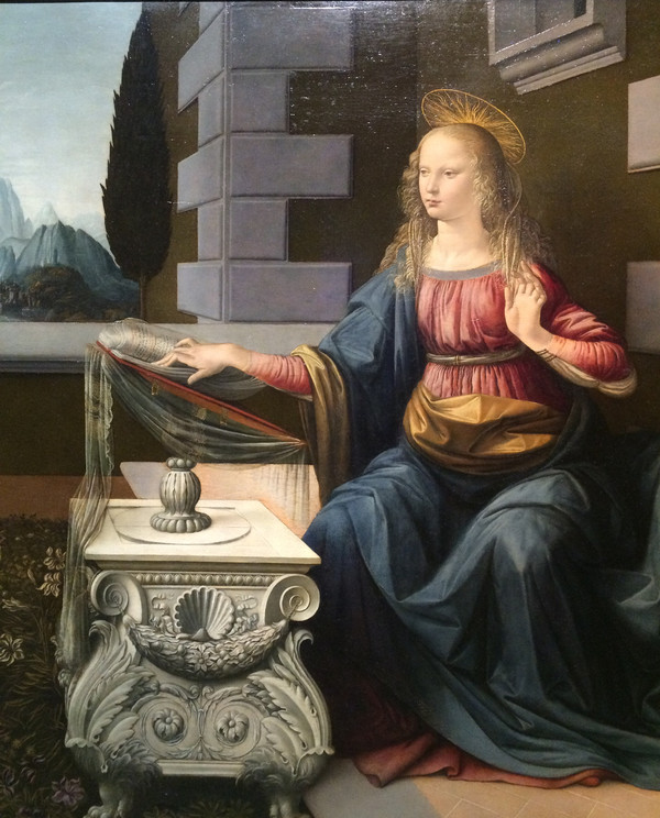 玛利亚身后高大的建筑和面前摆放着雕塑精美的几案衬托出庄严神圣的气氛,而天使屈尊而跪的姿态和深红色的裙裾,无不烘托着为了救度世人的耶稣的来临是一件无比重大神圣的事情。