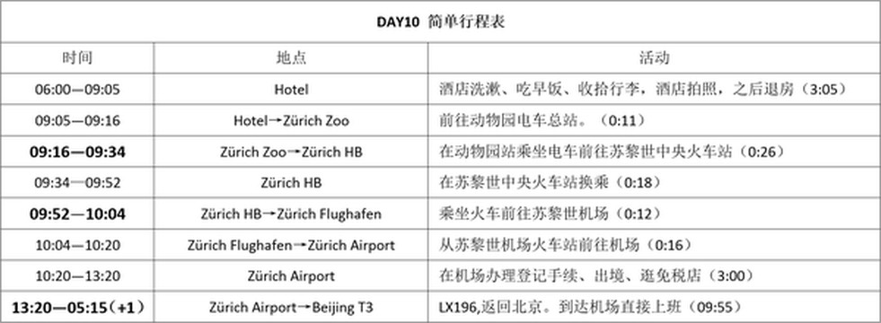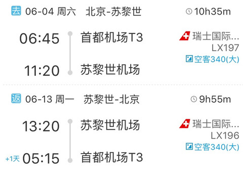 回程:苏黎世(ZRH)——北京(PEK) 航班:LX196 时间:13:20—05:15(+1)(9h55min)