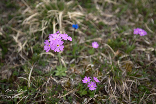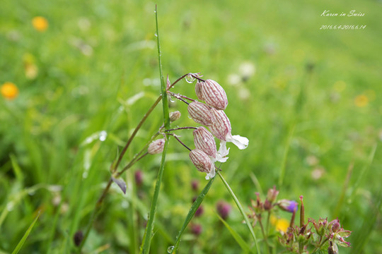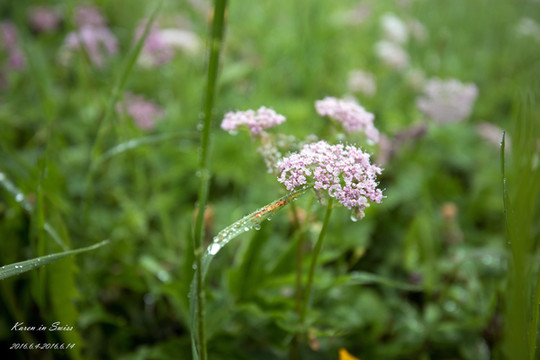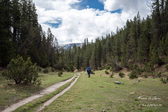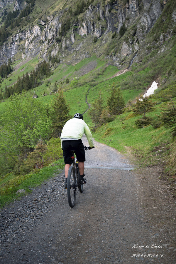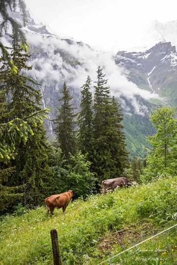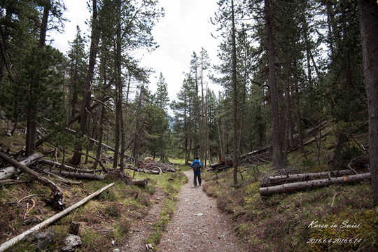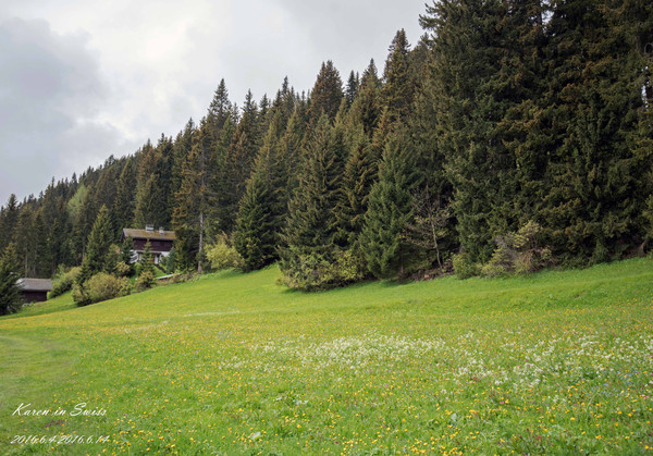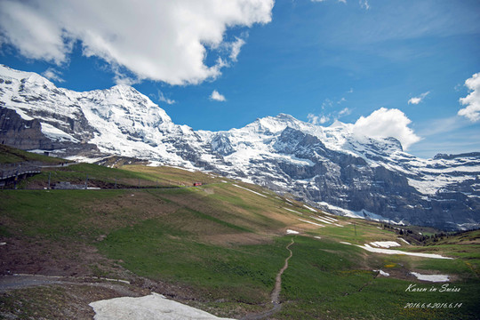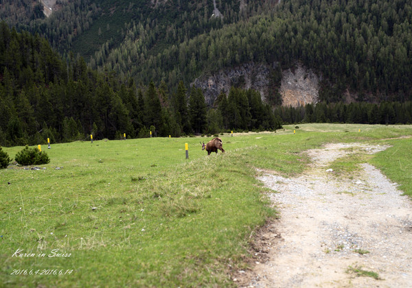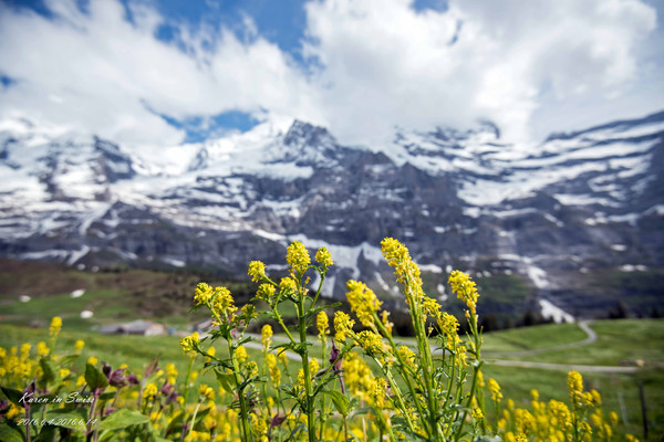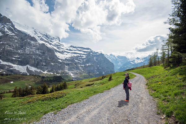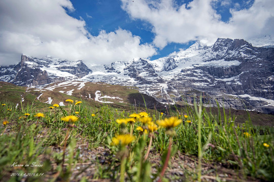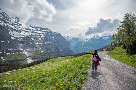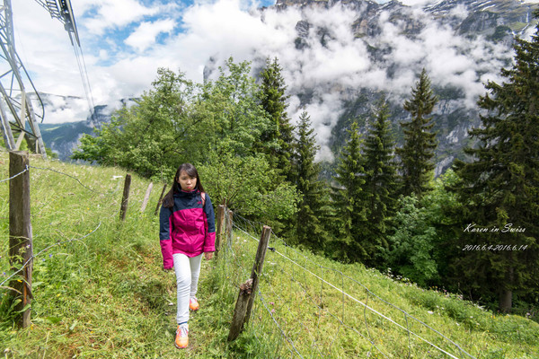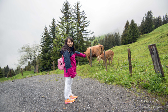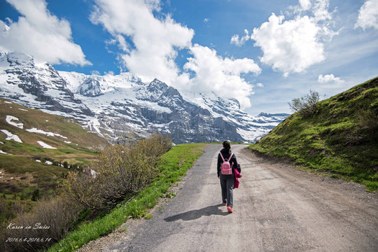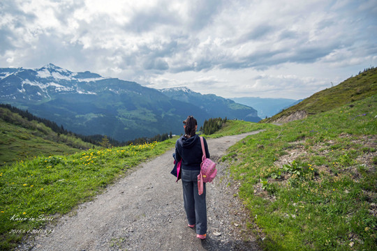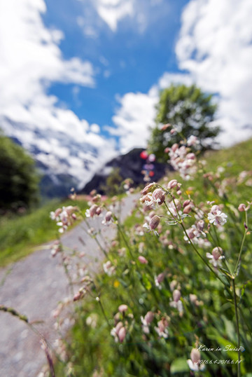 鲜花小径其实就是一条非常易走的徒步线路:Allmendhube→Blumental→Mürren,一路经过鲜花山谷,欣赏雪山美景,最终回到米伦。可能还是季节有些偏早,路两侧的野花并没有全部开放,但是零星的美丽小花已经开始偷偷盛开。零星小雨下的山间小路,不用打伞,但却空气湿润清新,实在是太舒服。偶尔路过一两群牛呀羊呀,过去喂喂草打打招呼也很有乐趣。这里完全就是我梦幻里的欧洲的田园生活嘛,这一切看上去是那么的恬静、惬意而又那么的浪漫,实在是太向往了。
