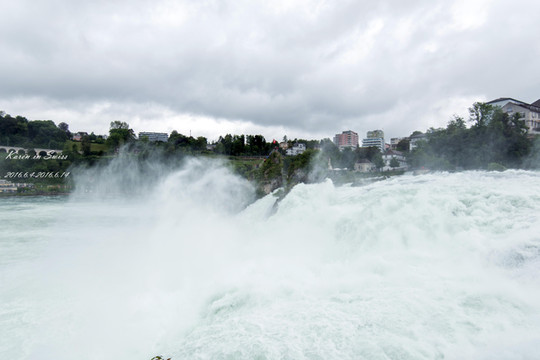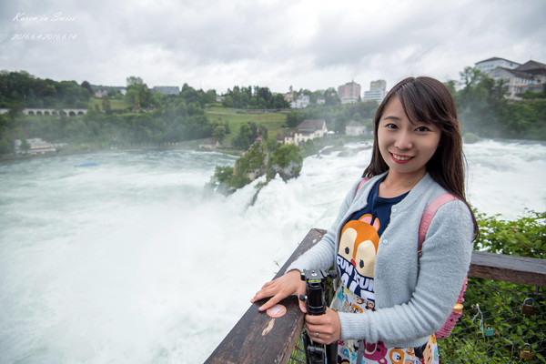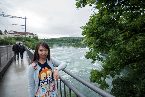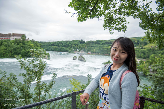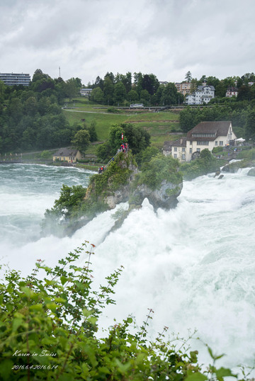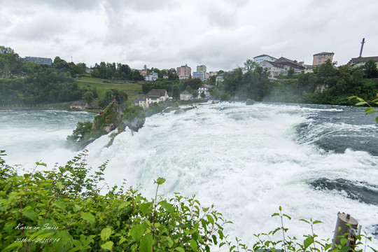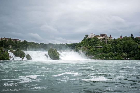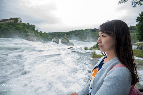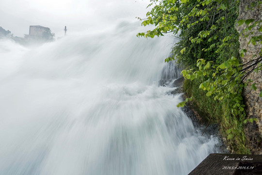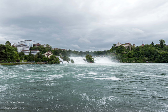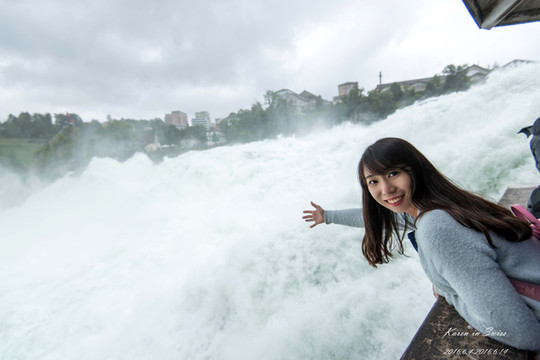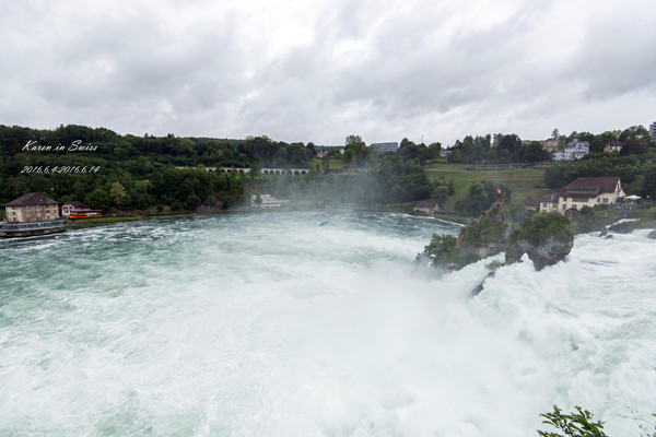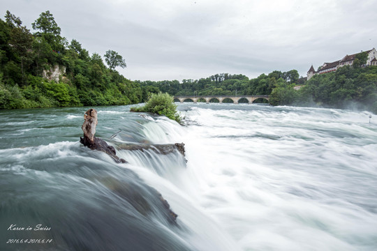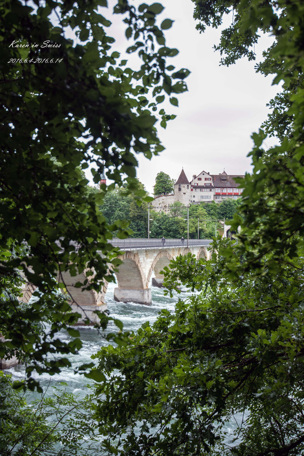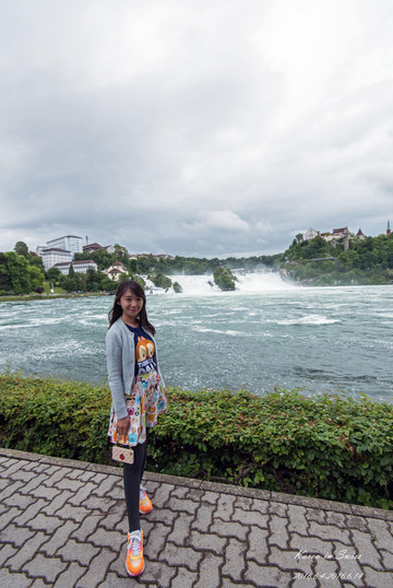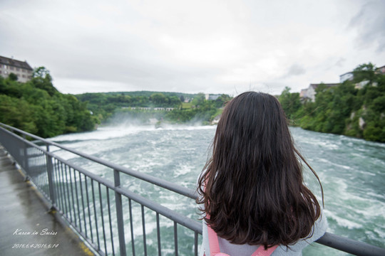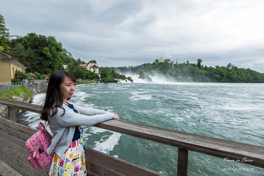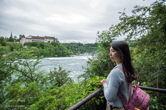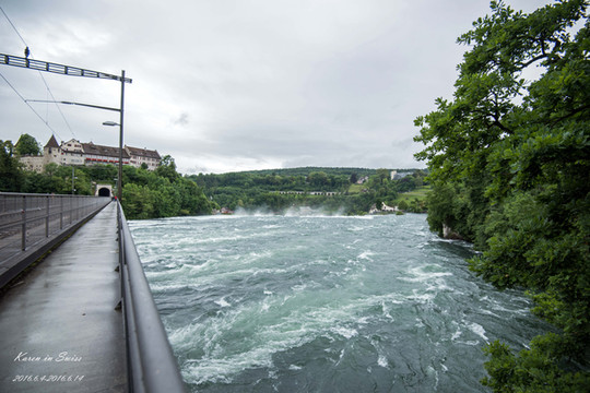 参观完劳芬城堡,我们就顺着城堡外侧的铁路,跨过瀑布上游来到瀑布的对岸。沿着岸边小路,在每个不同角度的观景台,远看瀑布全景以及劳芬城堡以及偶尔飞逝而过的火车。景色如此磅礴大气,再次感慨,自然与人文的结合是那么的恰到好处。