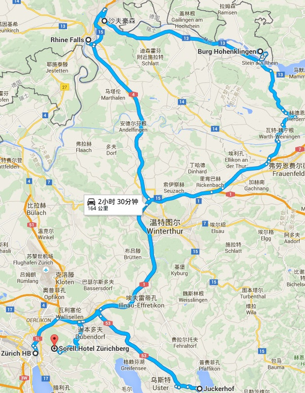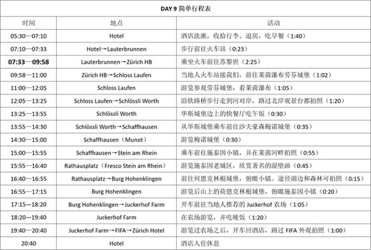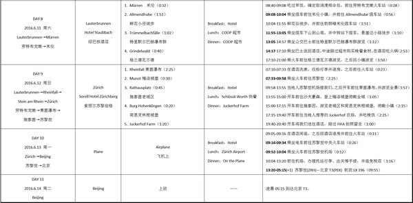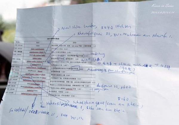 跟当地人大致沟通了几次,双方都认为既然是包车就要去火车不方便去但是开车方便去的美景和瑞士当地人最爱去的地方,经过几次行程商讨之后最终决定:早上从劳特布龙嫩坐火车前往苏黎世,大约10点司机直接在火车站接我们,开车带我们去游览莱茵瀑布、沙夫豪森、施泰因等北部小镇,如果时间允许,就带我们前往他推荐的郊区的Juckerhof Farm农场,吃过晚饭后,将我们送到酒店。