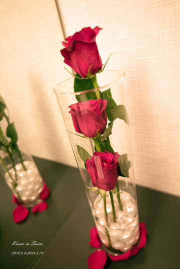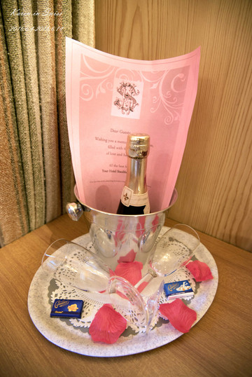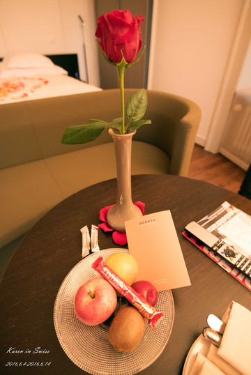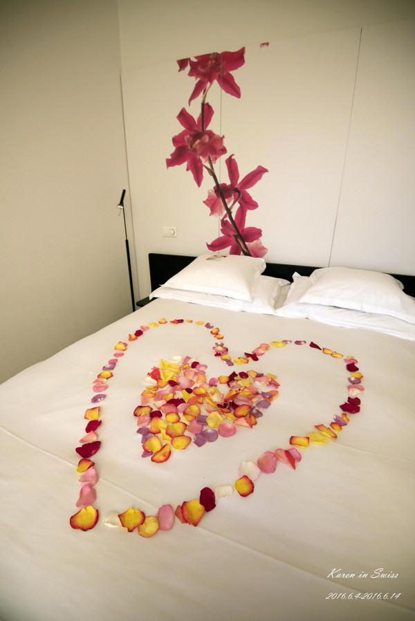 走进房间,我们都不约而同的哇了一声,房间的每个角落都被玫瑰花瓣包围着,布置得又温馨又浪漫。不愧是四星酒店,每个细节都安排的非常好。