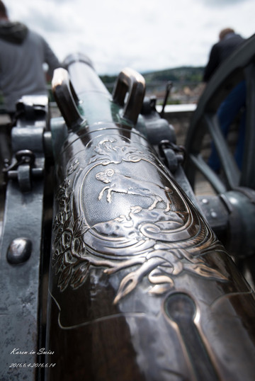 穿过葡萄园拾级而上,爬上回旋楼梯来到城堡空场上,莱茵河和两岸的城市美景尽收眼底。在那里还摆放了两台当年留下的大炮,像是再向后人讲述当年那悲惨场面。