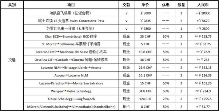 瑞士的公共交通相当发达,游览瑞士,除了租车自驾之外,最主要的方式就是乘坐火车。而瑞士通票绝对是瑞士非自驾自由行的必备!我的行程一共11天,但是瑞士通票只有8天和15天的(价格如下图),算来算去,我的每天行程都需要乘坐火车,选择8天的通票或者瑞士半价票,都不如直接购买15天的连续通票划算。所以一咬牙一跺脚,买了15天的连续通票。不过三年前的2人同行85折的优惠票价现在已经没有了,这一点真是不厚道!