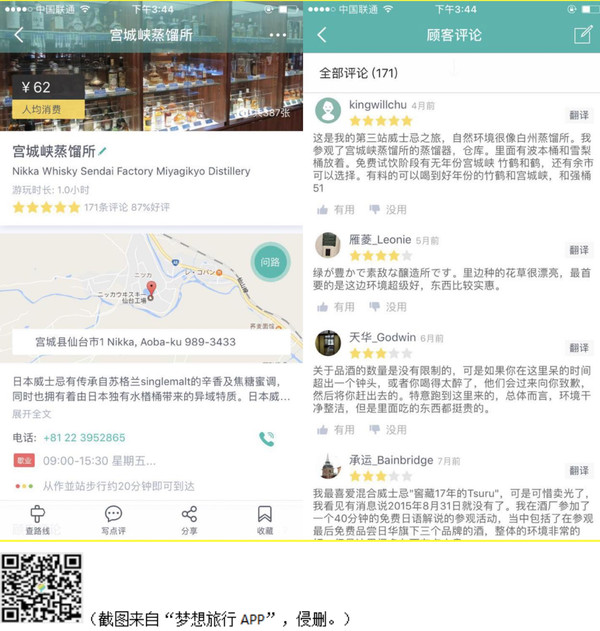 工厂是不能随便参观的,但是会有专门的见习团,由讲解员带领参观。见习团时间为早上9:30-11:30,下午12:30-3:30,记得是每半小时有一班,并且不收门票也不收见习费用……而且还提供免费试喝~特意在“梦想旅行APP”上找了个截图,上面有这的联系电话和路线~很多达人的评论也在上面~重点来了,敲黑板!看图上显示的游玩时长:1小时!如果在这里免费试喝超过一钟头就会有工作人员将你请出去啦~大家喝酒的时候记得控制时间......