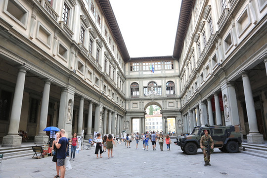 乌菲兹美术馆原本是美第奇家族的官邸,始建于1560年,整个庞大的宫殿式建筑直到1581年才完工。目前可谓是意大利甚至欧洲数一数二的顶级展馆,展出了美第奇家族的私家收藏,包括波提切利《维纳斯的诞生》和《春天》、达芬奇《天使报喜》等作品。可惜,排队人数众多, 没能进去参观。