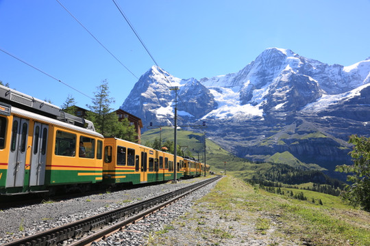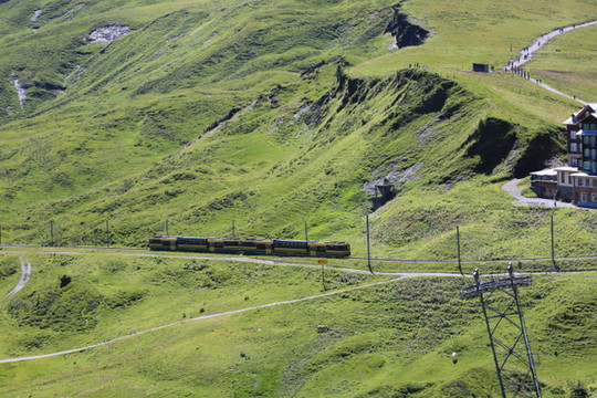 从因特拉肯火车站发出去往少女峰的火车,在Zweilutschinen站会从中间分开,一部分车厢前往Grindelwald,一部分车厢前往lauterbrunnen,两者最后都到达Scheidegg(2016m),建议上山和下山选择不同路线,感受不同小镇的风光。从lauterbrunnen,可前往(Schilthorn)。