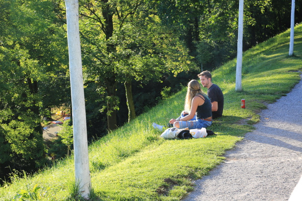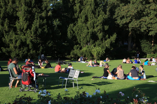 在玫瑰园草坪上休憩的人们