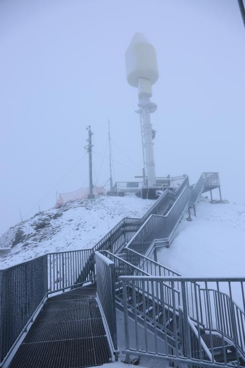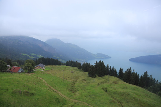 山上雾蒙蒙,什么也没看到。坐齿轮火车到达WEGGIS 缆车站,乘坐缆车下车。