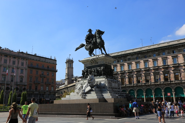 大教堂广场中央耸立着意大利王国第一任国王维多利奥·埃玛努埃尔二世的骑马铜像