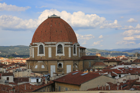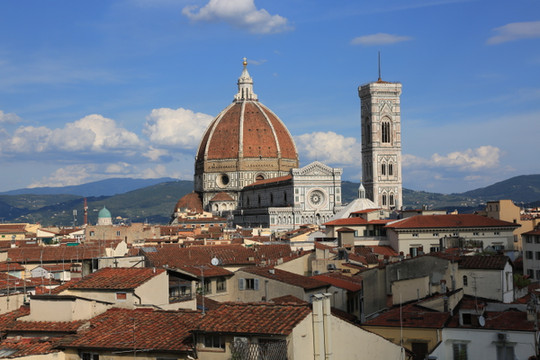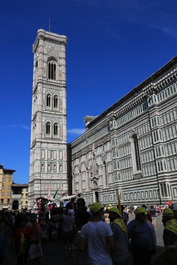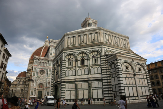 圣母百花大教堂是天主教佛罗伦萨总教区的主教堂,也是世界上第三。它是佛罗伦萨的标志,也是佛罗伦萨市内最高的建筑。教堂建筑群由主教堂、和洗礼堂构成,不仅规模宏大,更是整个文艺复兴初期的代表性建筑。 教堂外立面搭配使用鲜艳的红色、墨绿色和白色大理石,拼成几何图形,非常壮观,将文艺复兴时代所推崇的古典、优雅、自由诠释得淋漓尽致。