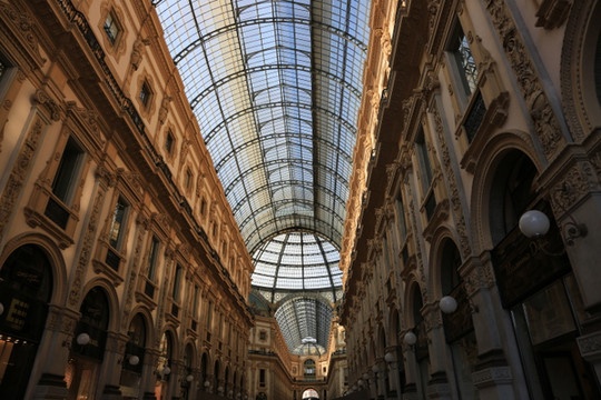 奢华、气派的,一个带顶棚的拱廊街,周边全是名牌商场。