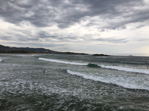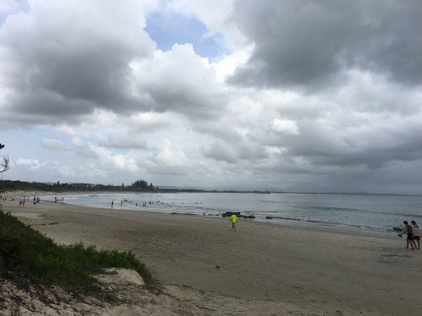 下来后,想到海边玩玩,到处的刷卡收费停车场,当时看不懂刷多少钱,停多长时间,因此就在小镇里转哪转,终于在镇外,看到有人停车的海滩,兴冲冲停车去海滩,尽管天阴沉的,但海滩的沙子细而柔软,非常舒服。没等我们高兴多久,就哗啦啦下起了大雨,跑回车子里。再回小镇,看看镇容镇貌后,我们只好挥挥手,告别了拜伦湾,重上太平洋高速公路,行走到下一个目的地,科夫斯港。