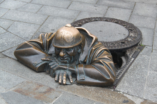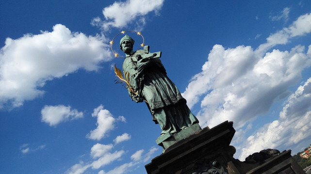 ◎约翰·内波穆克铜雕,这位口风极严的牧师因恪守承诺拒绝向瓦茨拉夫四世透露王后告解的秘密而被扔进,圣维塔大教堂里有描绘此事件的油画。