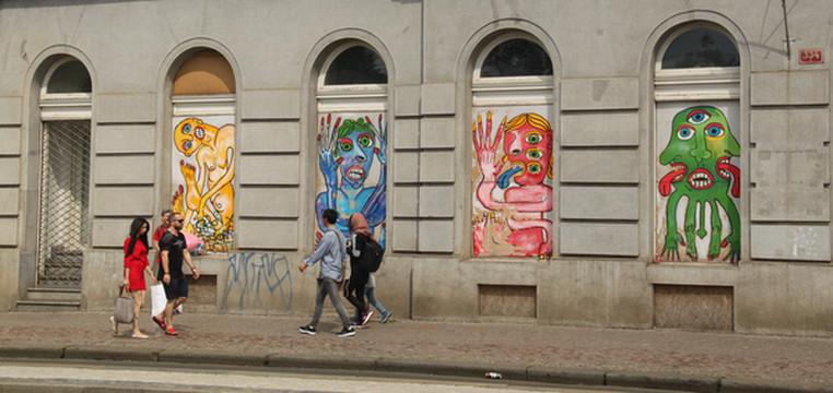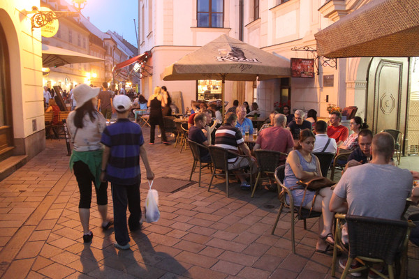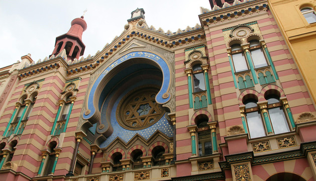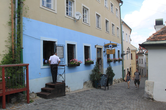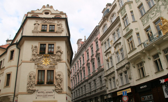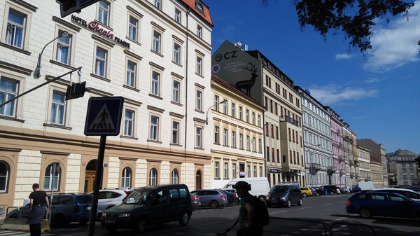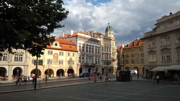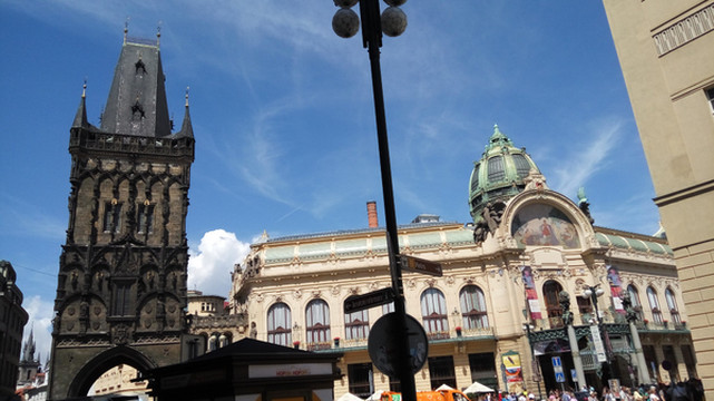 出门这条街叫Jeruzalemska,ska后缀是斯拉夫语系的“街”,Jeruzalem凭读音可知是耶路撒冷(此间可能是犹太人区,街上还有颇具规模的犹太会堂),这条街通向火药塔 (Prasna brana) 和市民会馆 (Obecni dum)。