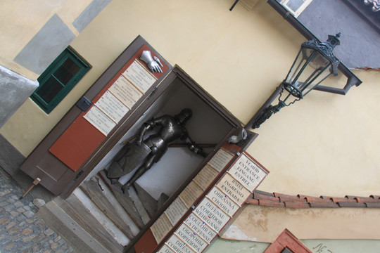 攻略上指示,广场周边有三四幢建筑都与卡夫卡相关,他的一生几乎都在这里度过。说到卡夫卡,其实是以德语写作成名,捷克与德奥接壤,文化、宗教和习俗上皆深受德国影响,捷克人亦有“日耳曼化的西斯拉夫人”之说。