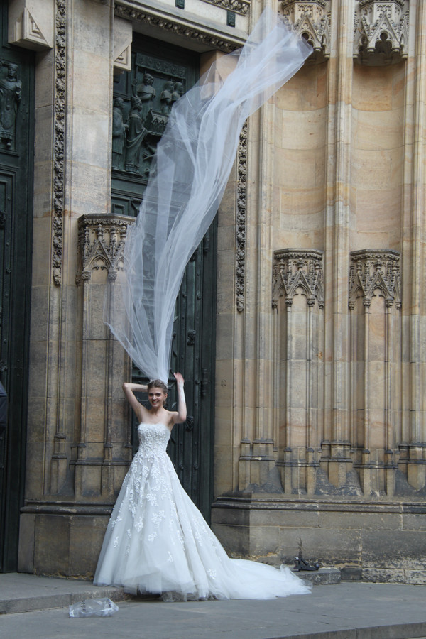 ◎教堂前拍片的美女头纱被风垂直送起,冷艳表情瞬间盛开如花笑靥。