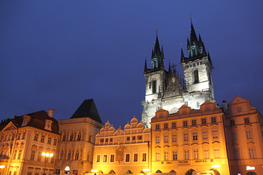 等夜幕完全降临,泰恩教堂 (Chram Matky Bozi pred Tynem) 双塔又变幻白银被身。