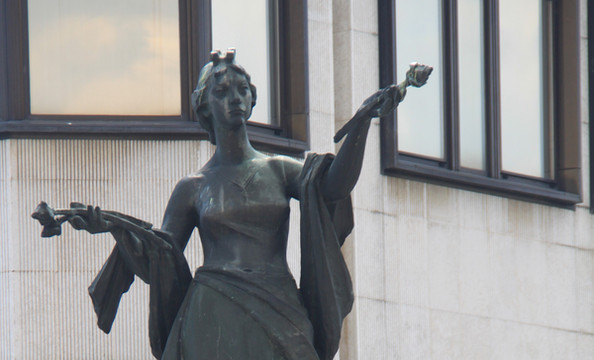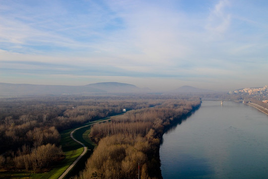 绿色的自由桥 (Szabadság hid) 在维修中,远处盖莱特山顶上双手高举橄榄枝的自由女神碑是为纪念二战苏军解放布达佩斯而建,当时一同落成的还有尊举旗的苏联红军士兵。89苏东风波后,像被撤走,碑还是留了下来。