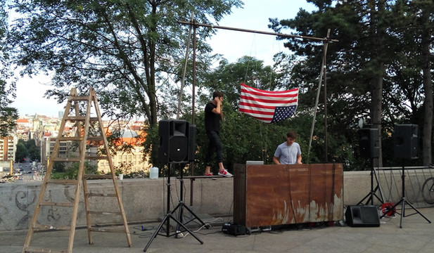 乐师在调试音效,倒挂的星条旗是不是崇尚列侬的捷克青年这场音乐会的主题?
