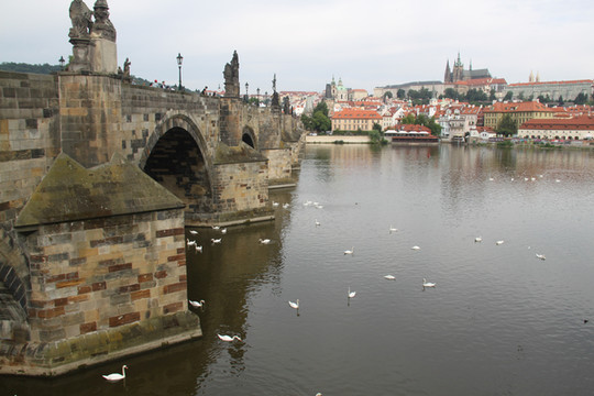 饭后步至著名的查理大桥 (Karluv most),天清气爽,宽阔的伏尔塔瓦尔河两岸建筑明快缤纷,布拉格城堡高据山丘,三十尊巴洛克圣像拱卫桥侧,最著名的圣约翰铜雕2010年世博会曾在捷克馆驻场半年,此番也算熟人重逢。